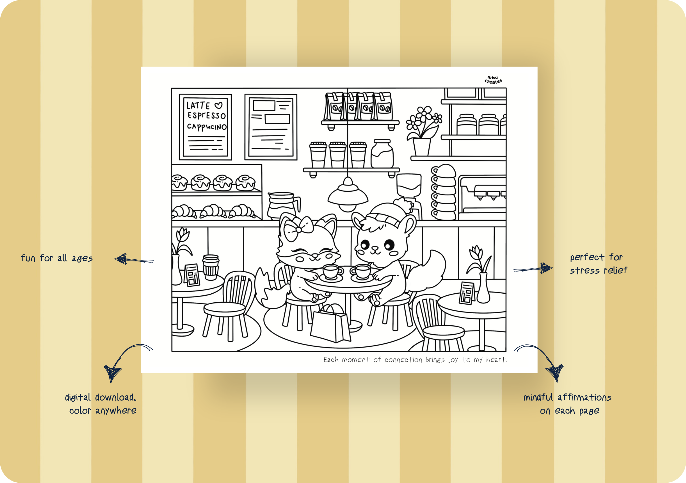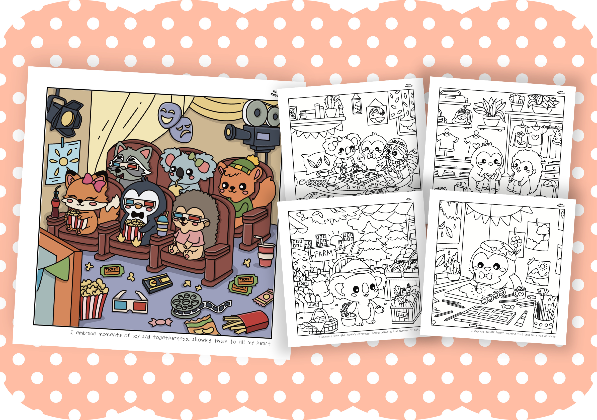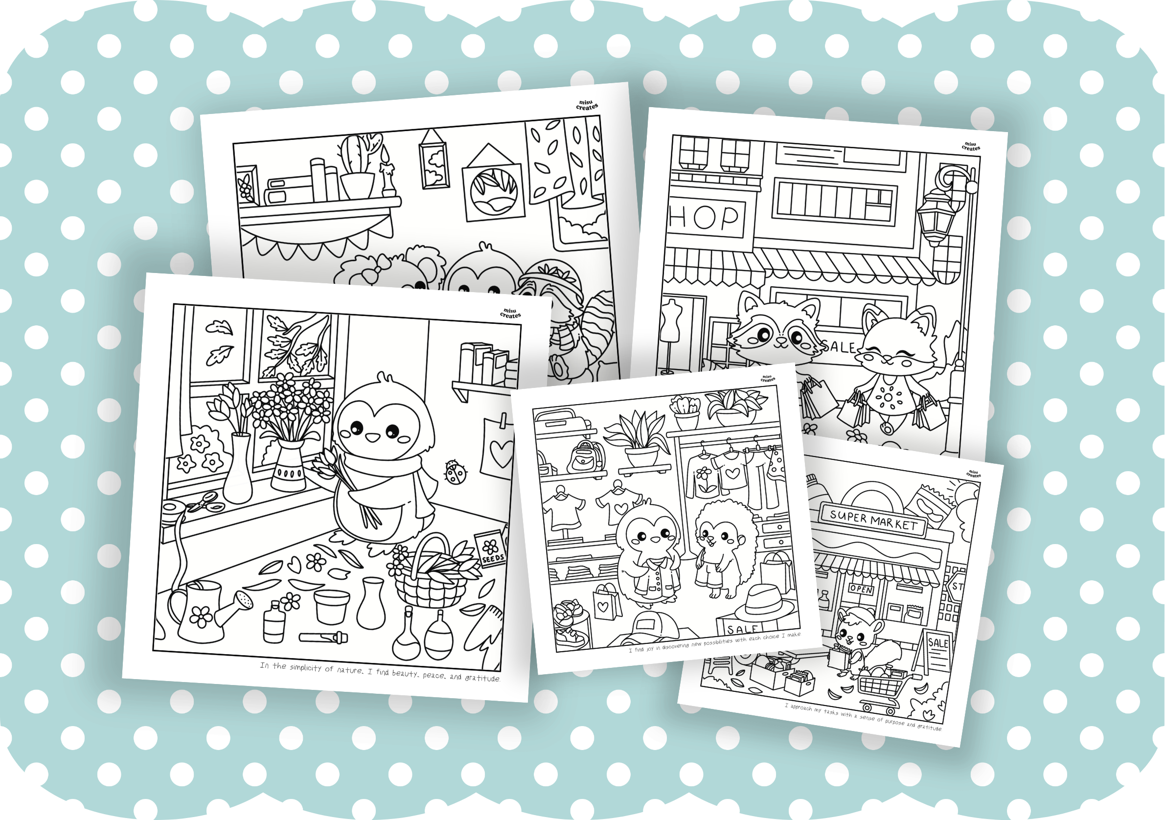 No, you cannot resell or repost the coloring pages. These pages are for personal use only. If you choose to share your completed artwork on social media, please credit and tag @misucreates. Remember, you may only post your colored-in pages!