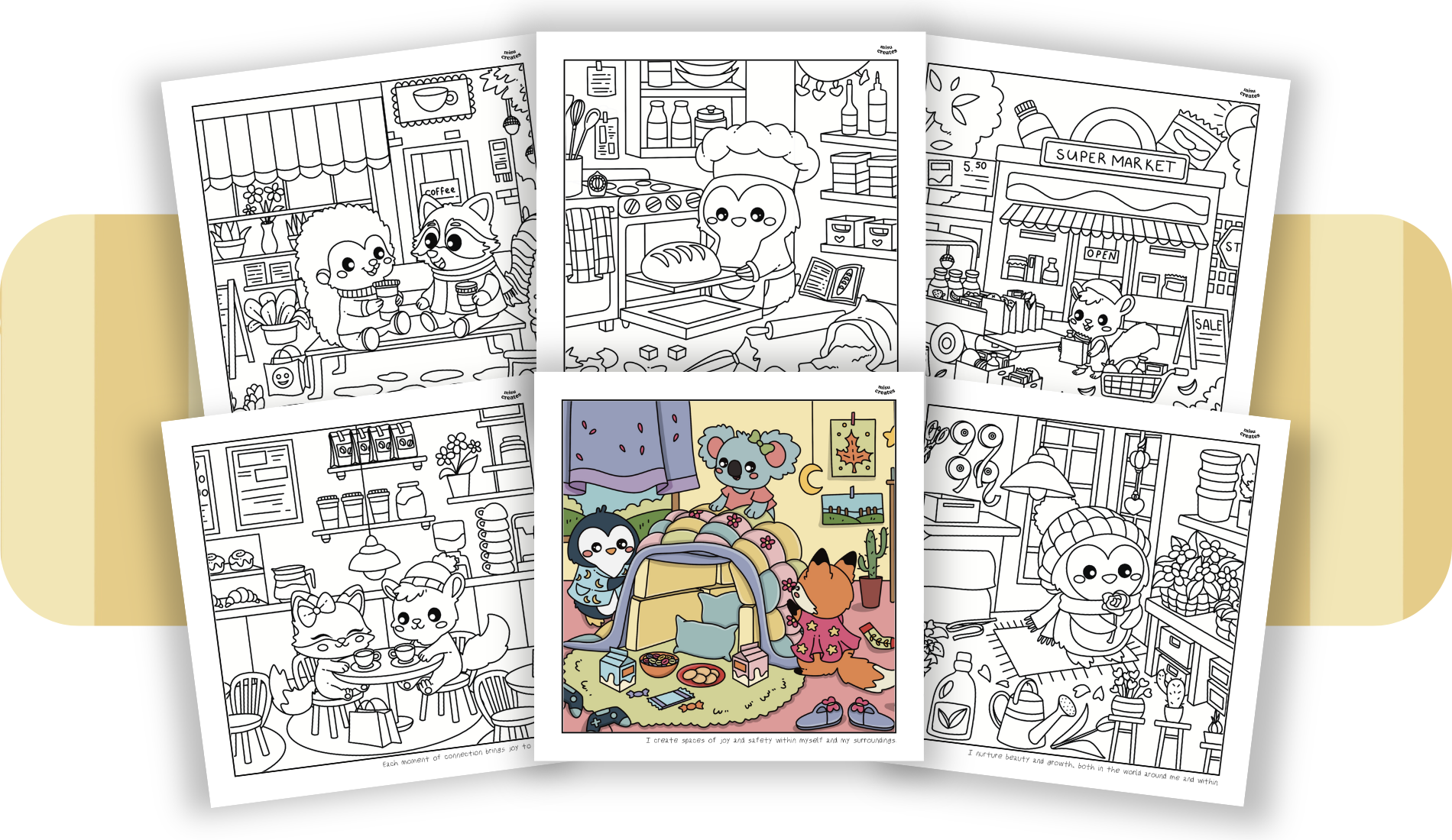 The Cozy Escape Coloring Book offers more than just coloring—it brings you into a world of cozy, relaxing scenes with charming characters. Each page includes a mindfulness phrase, perfect for reflection as you color, allowing you to turn each session into a peaceful meditation.